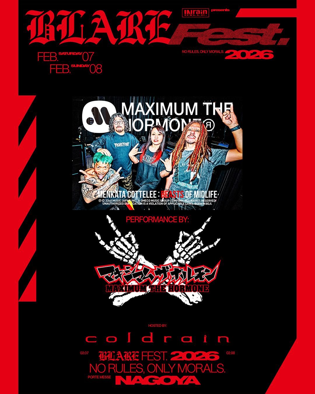 2026年2⽉7⽇(⼟)、8⽇(⽇)に愛知県・ポートメッセなごやにて開催されるcoldrain主催“BLARE FEST. 2026”にホルモンの出演が決定!