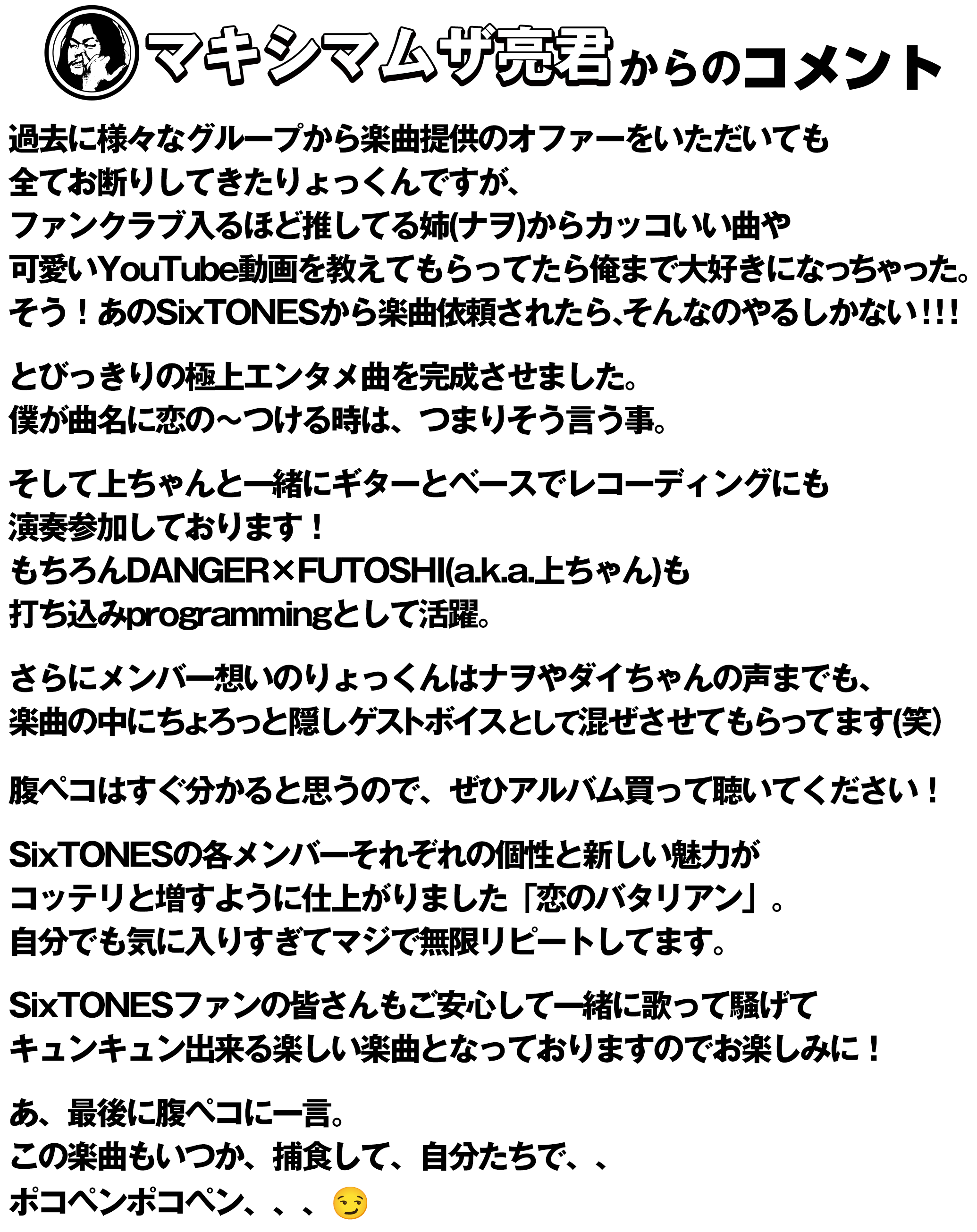 SixTONES 5th Album『GOLD』にマキシマムザ亮君が「恋のバタリアン」を楽曲提供。