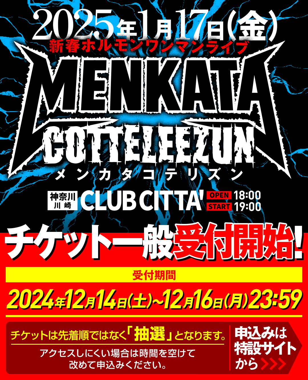 新春ホルモンワンマンライブ「メンカタコテリズン」のチケット一般抽選受付が只今より開始!