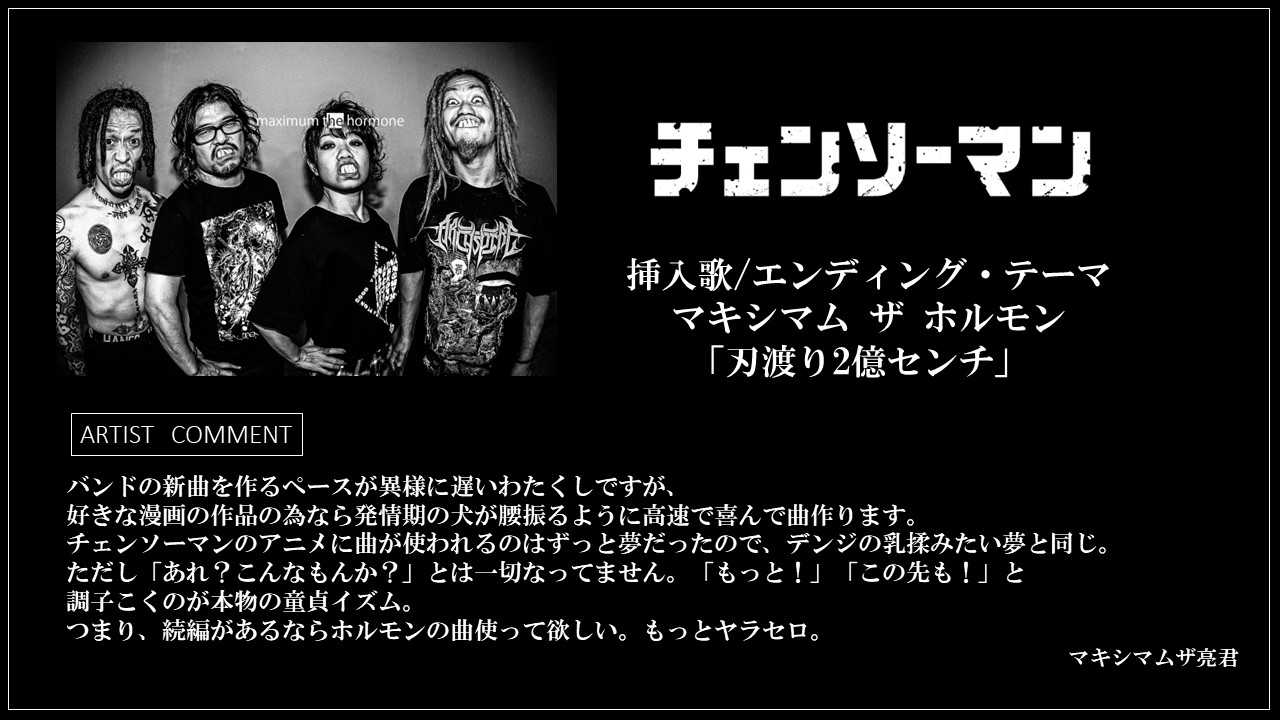 アニメ「チェンソーマン」の 挿入歌&EDテーマとしてホルモンの新曲『刃渡り2億センチ』が決定!