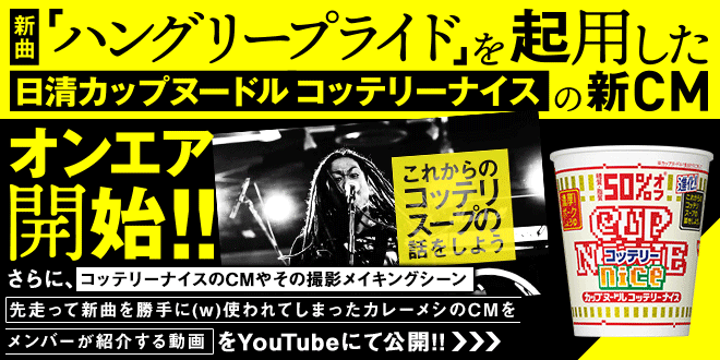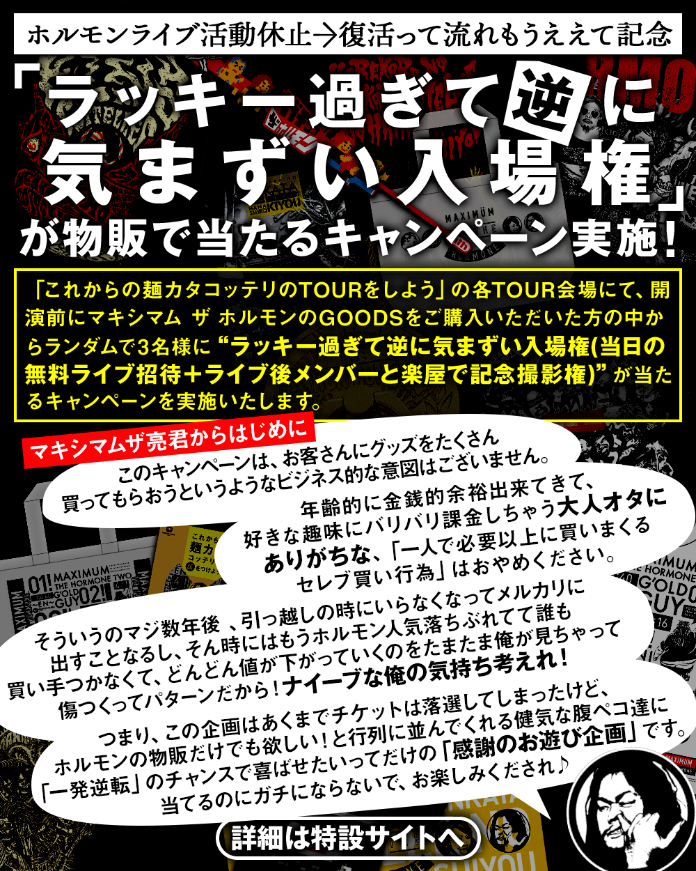 現在ダイスケはんのリハビリのためライブ活動は休止中ですが、日清カップヌードルコッテリ―ナイスのCM放送や“ホルモン2号店”の募集など、止まることなく進み続けておりますので今後ともマキシマム ザ ホルモンの応援をどうぞよろしくお願いします!