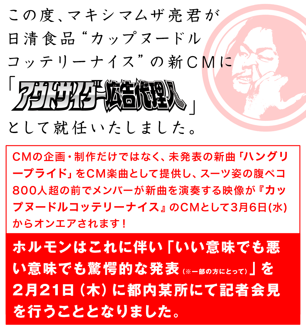亮君が「カップヌードルコッテリーナイス」にアウトサイダー広告代理人として就任した報告に合わせ、なんと音楽業界初となる【フランチャイズ制導入】を発表!