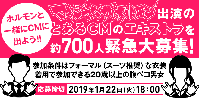 緊急募集します。参加希望の方はエキストラ応募専用ページより“応募詳細、注意事項、ホルモンとの