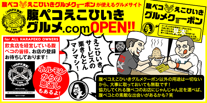 “腹ペコえこひいきグルメ.com”は皆様のお店の登録をお待ちしております。腹ペコを大勢呼んで“えこひいきグルメクーポン”をたくさん集めたお店には、集めたクーポンの枚数に応じて“ホルモンからの恩返し”もありますので、是非ご登録ください!