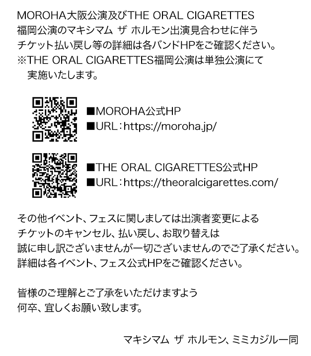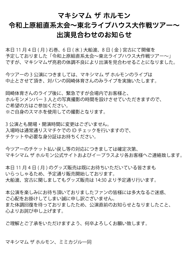 令和上原組直系太会~東北ライブハウス大作戦ツアー~ 出演見合わせのお知らせ
