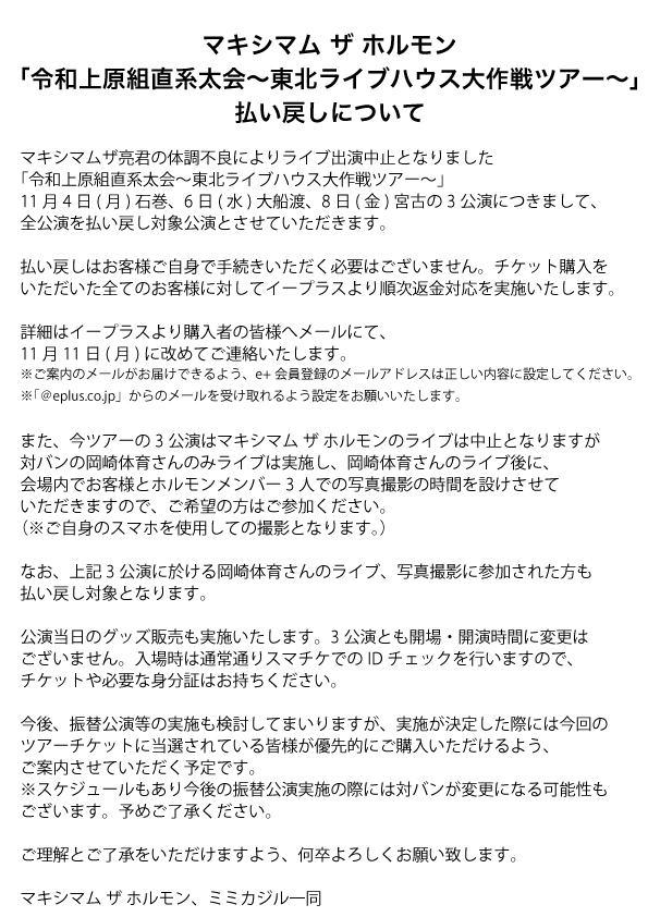 令和上原組直系太会~東北ライブハウス大作戦ツアー~ チケット払い戻しについて