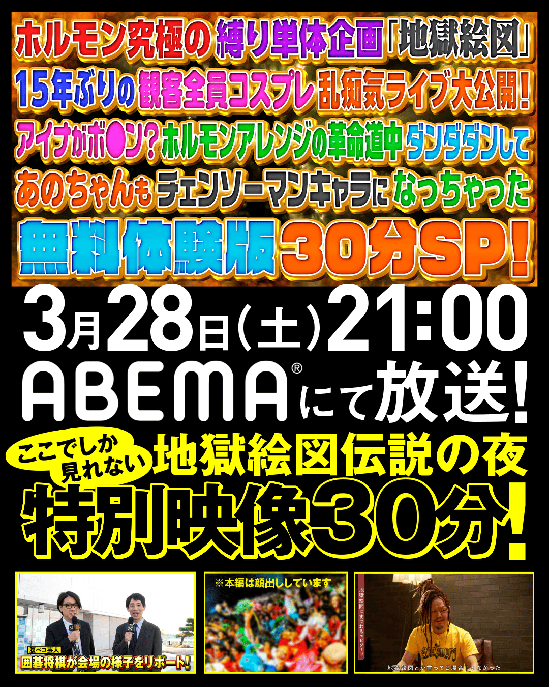 15年ぶりに復活した伝説のイベント“地獄絵図”が無料体験できるスペシャル特番がABEMAにて放送決定。