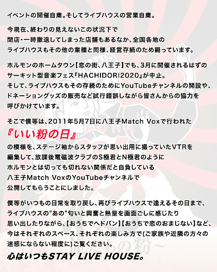本ライブは「爪爪爪/「F」」の初回盤にランダムで封入された「いい粉」を持っている人だけが応募・参戦できた貴重なライブ映像となっております。コロナウィルスを巡る昨今の状況、そして本動画を解禁するに至ったホルモンメンバーの思いとともに、皆様ぜひご覧ください!