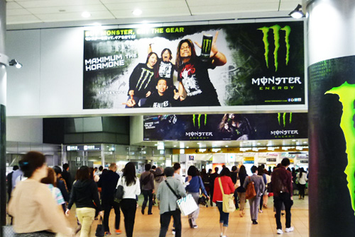 各地のJR・地下鉄・私鉄駅構内に掲示中のモンスターエナジードリンクの広告にホルモンが登場!
