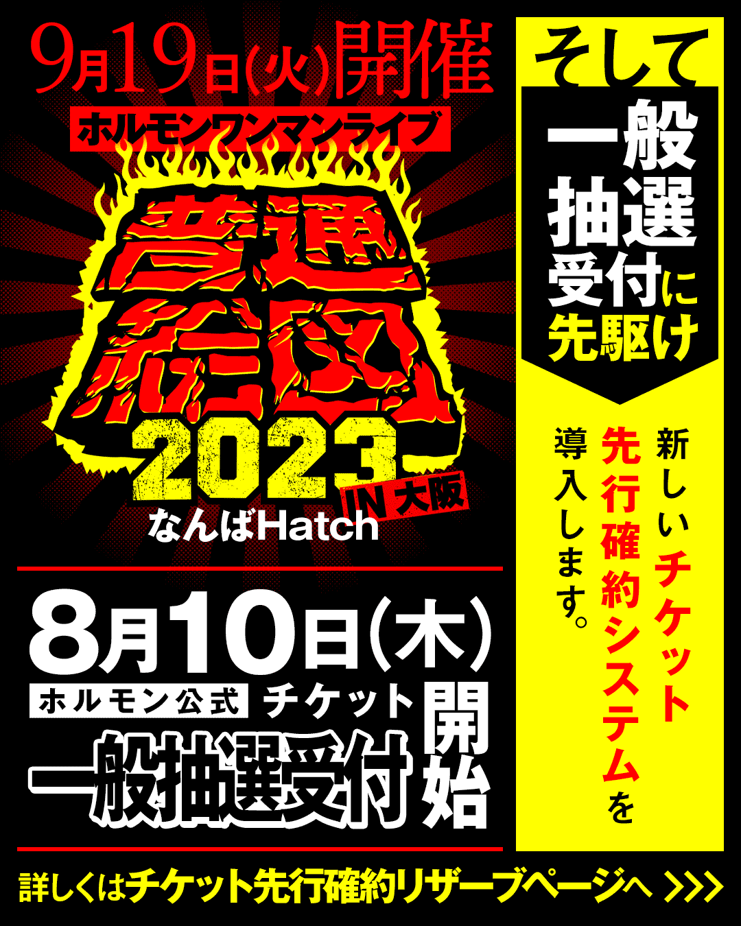 9月19日(火)に大阪なんばHatchにて開催されるホルモンワンマンライブ“普通絵図 2023”のホルモン公式チケットの一般抽選受付は8月10日(木)よりスタート!