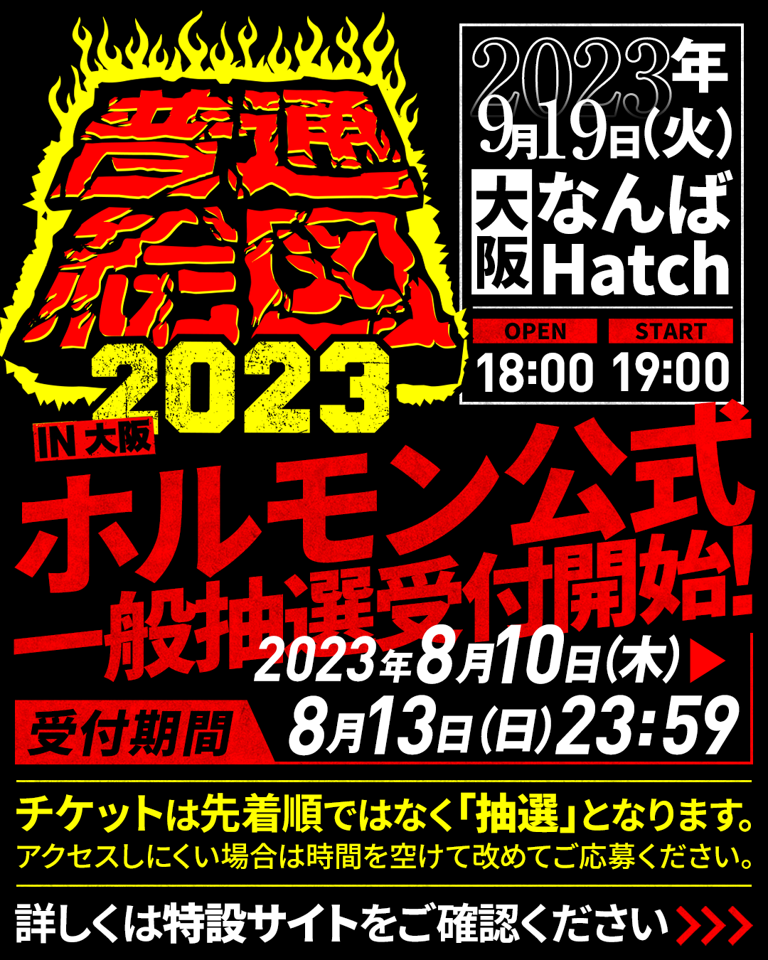 9月19日(火)、大阪なんばHatchにて開催される“普通絵図 2023”のホルモン公式チケット一般抽選受付が只今よりスタート!