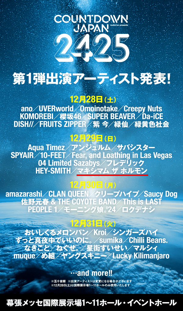 12月28日(土)~31日(火)に千葉県・幕張メッセ国際展示場1~11ホール・イベントホールにて開催される“COUNTDOWN JAPAN 24/25”にホルモンが出演決定!