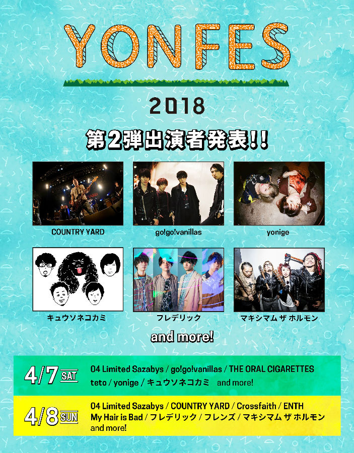 4月7日・8日に愛知にて開催される04 Limited Sazabys主催“YON FES 2018”に