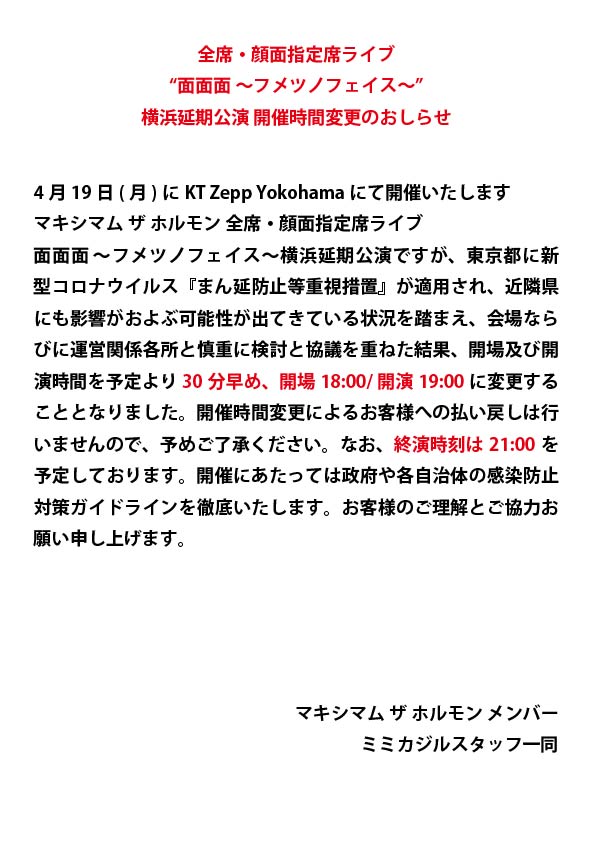 "面面面〜フメツノフェイス〜”横浜延期公演 開催時間変更のお知らせ