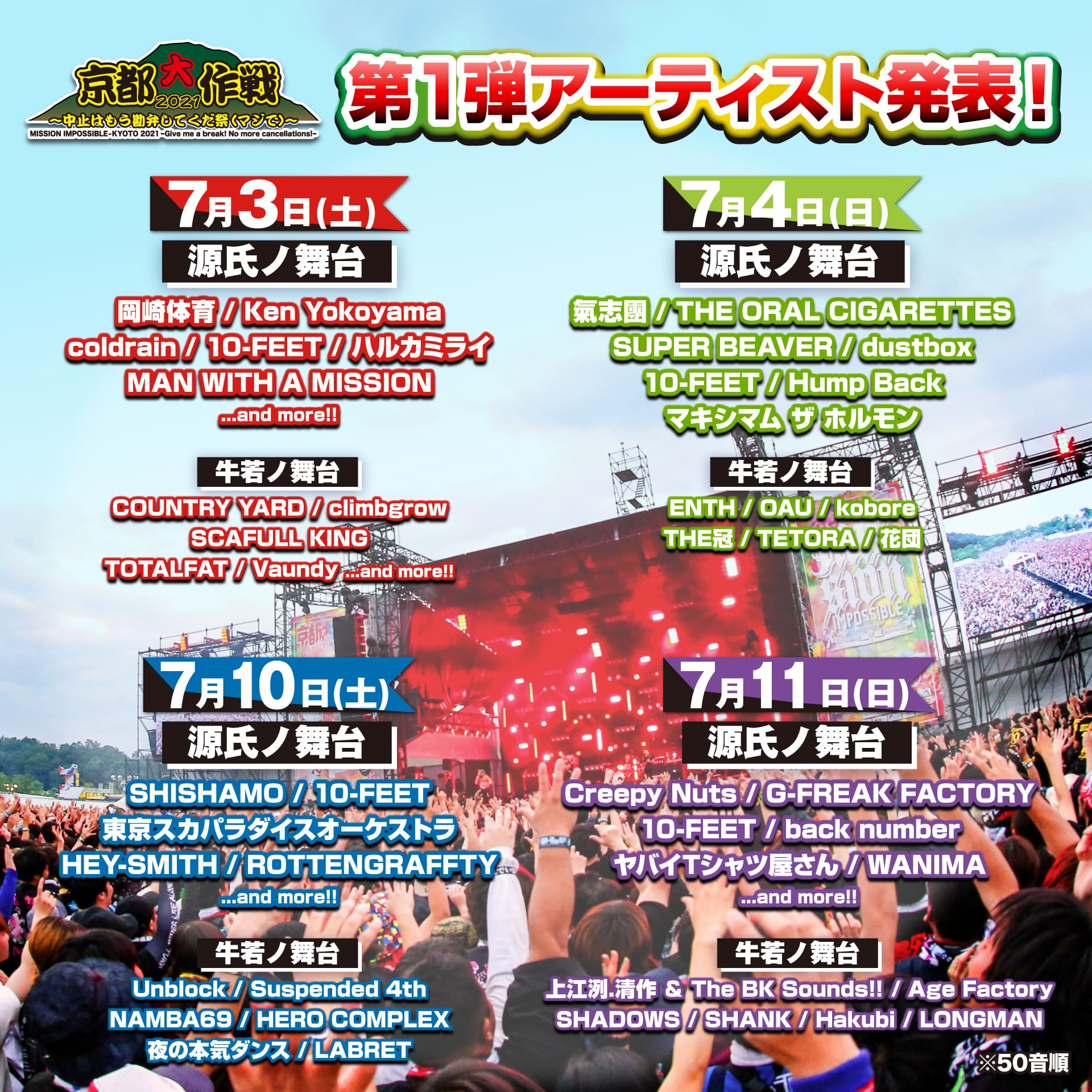 7/3(土),4(日),10(土),11(日)に京都府立山城総合運動公園にて開催される10-FEET主催のフェス「京都大作戦2021〜中止はもう勘弁してくだ祭(マジで)〜」にホルモンの出演決定!