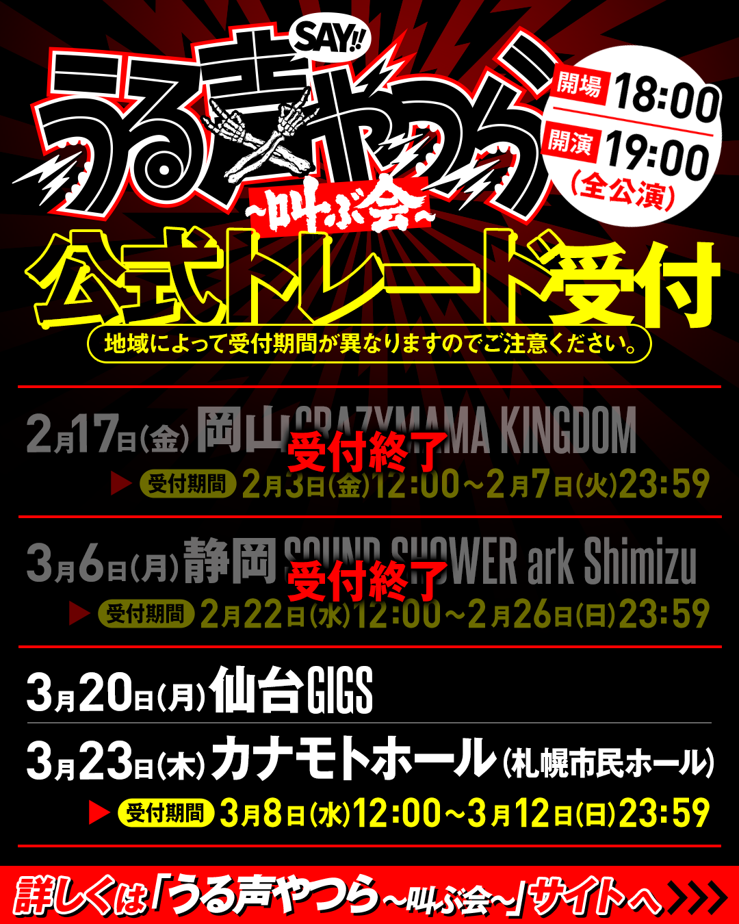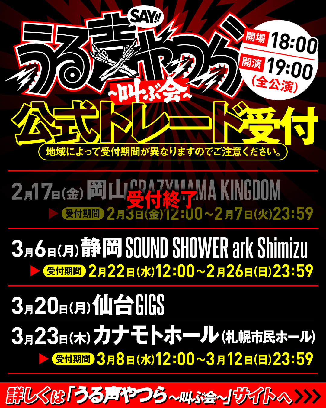 3/6(月)に開催される『うる声やつら~叫ぶ会~』静岡公演のチケット公式トレードが本日より受付開始!