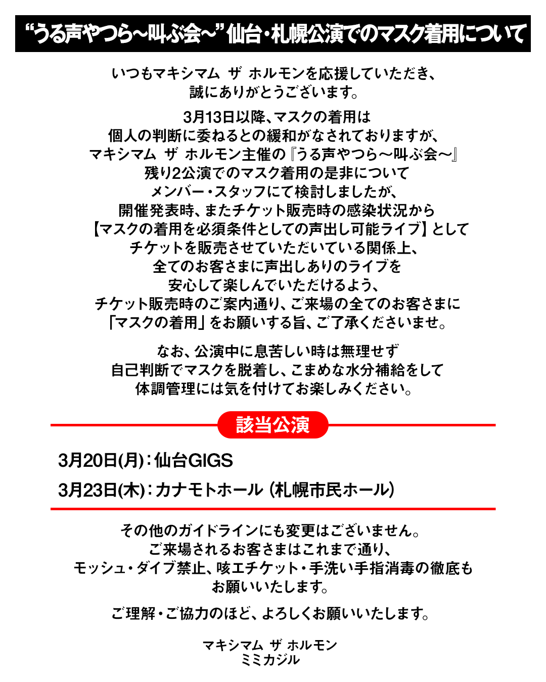 “うる声やつら~叫ぶ会~”仙台・札幌公演でのマスク着用に関するお知らせ。