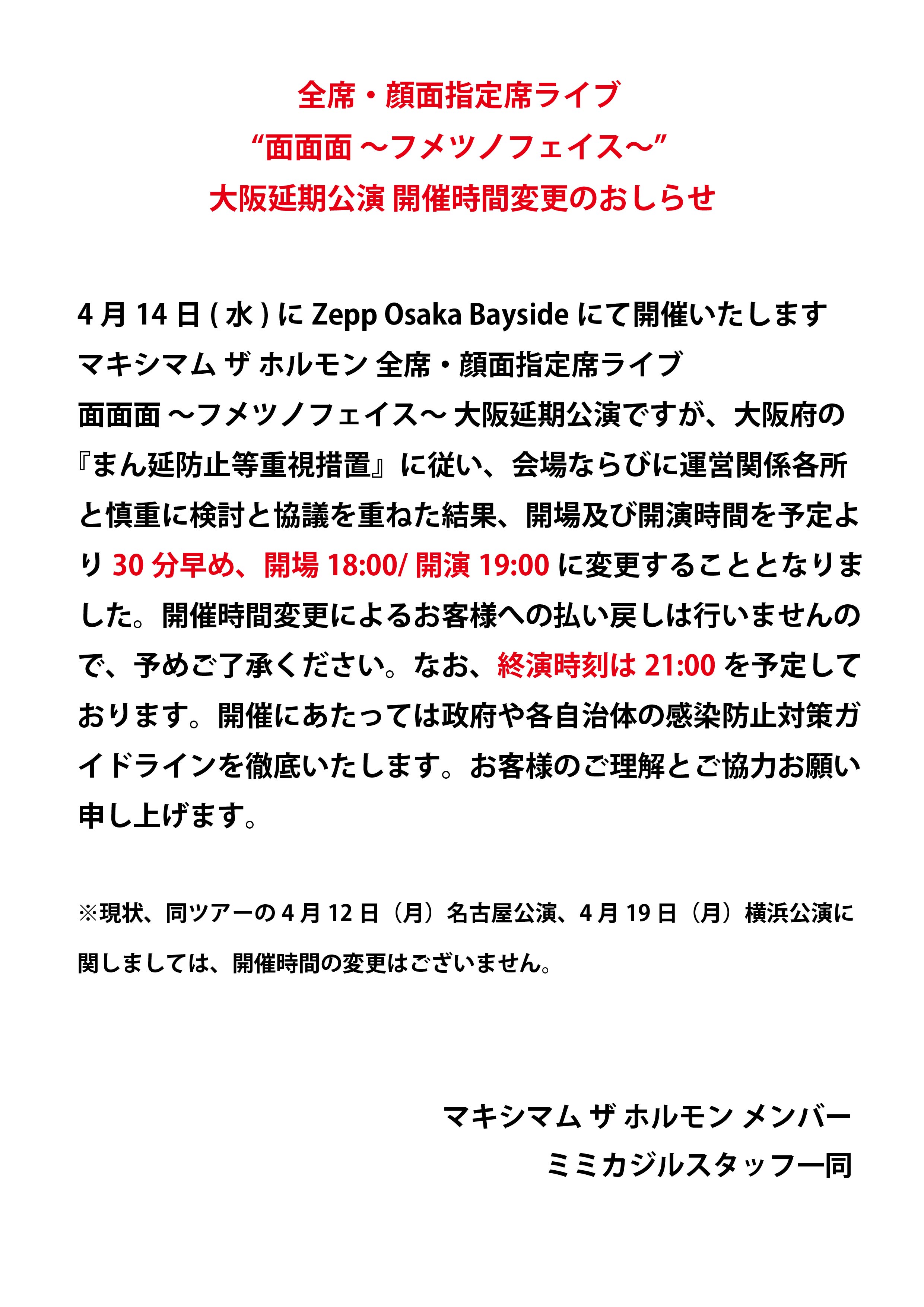 "面面面〜フメツノフェイス〜"大阪延期公演 開催時間変更のお知らせ
