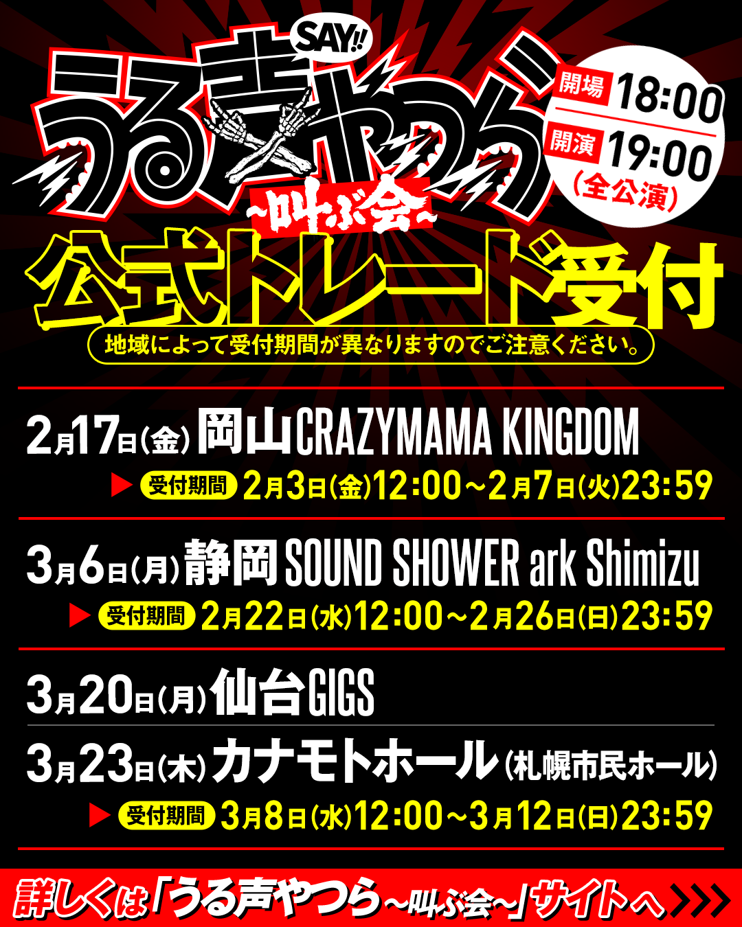 2/17(金)に開催される『うる声やつら~叫ぶ会~』岡山公演のチケット公式トレードが本日より受付開始!