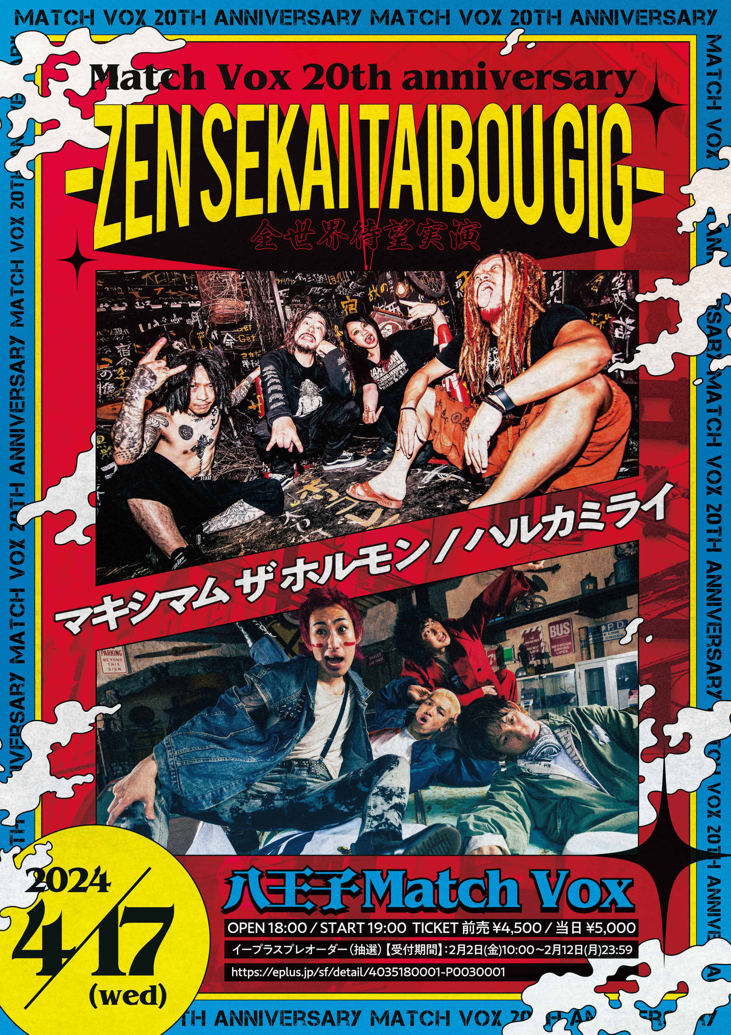 4月17日(水)にホルモンの地元・恋の街八王子のライブハウス 八王子Match Voxにて開催される“Match Vox 20th anniversary-ZEN SEKAI TAIBOU GIG-”にホルモンが出演決定!