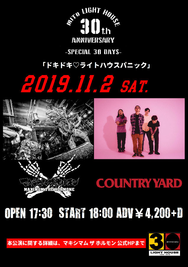 11月2日(土)に茨城県 mito LIGHT HOUSE にて開催される“MITO LIGHT HOUSE 30TH A NNIVERSARY-SPECIAL 30 DAYS-「ドキドキ❤ライトハウスパニック」”へ、ホルモンの出演が決定しました!