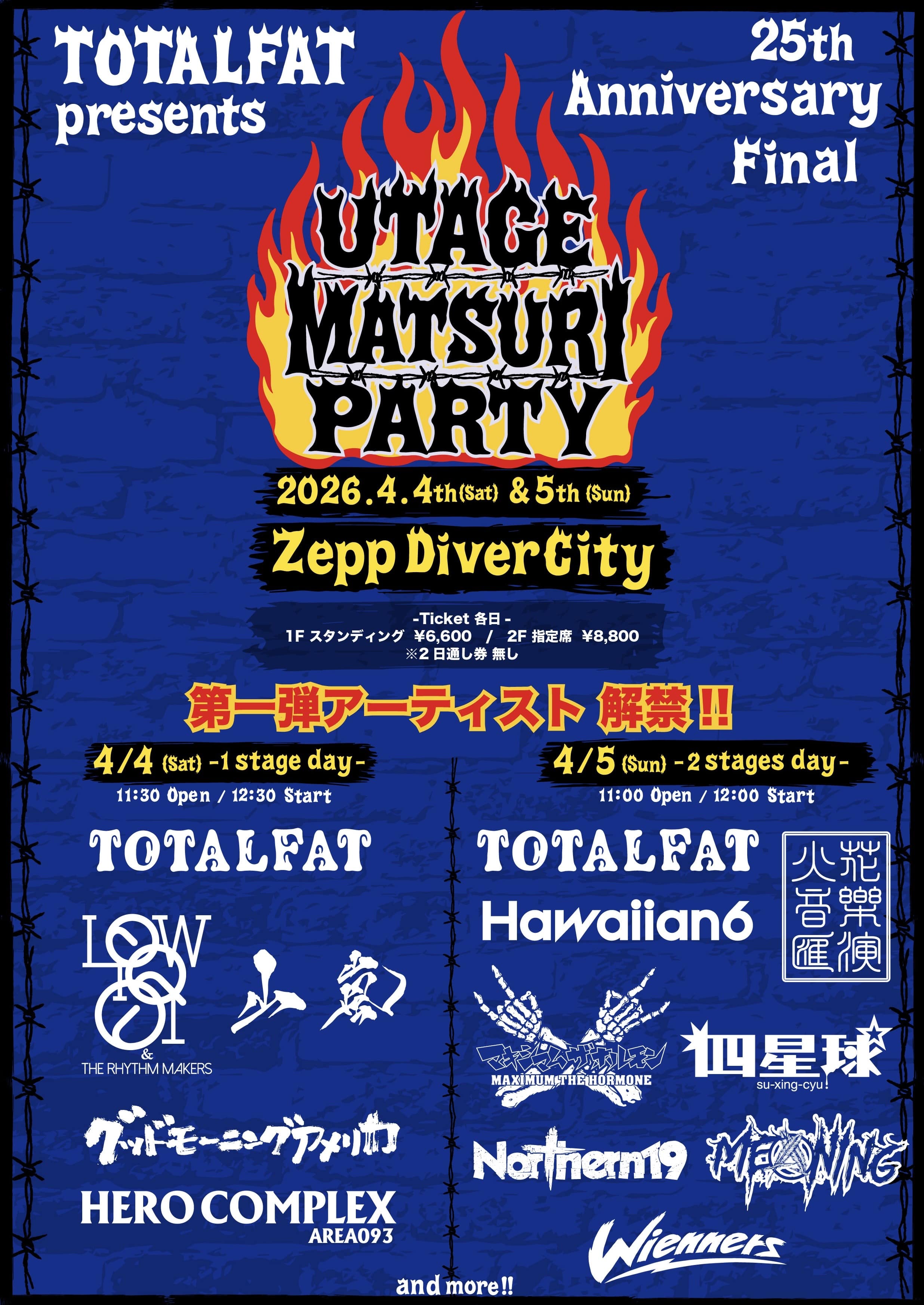 2026年4月4日(土)、5日(日)に東京都・Zepp DiverCity (TOKYO)にて開催されるTOTALFAT主催「UTAGE MATSURI PARTY」にホルモンが出演決定!※ホルモンの出演日は2026年4月5日(日)となります。