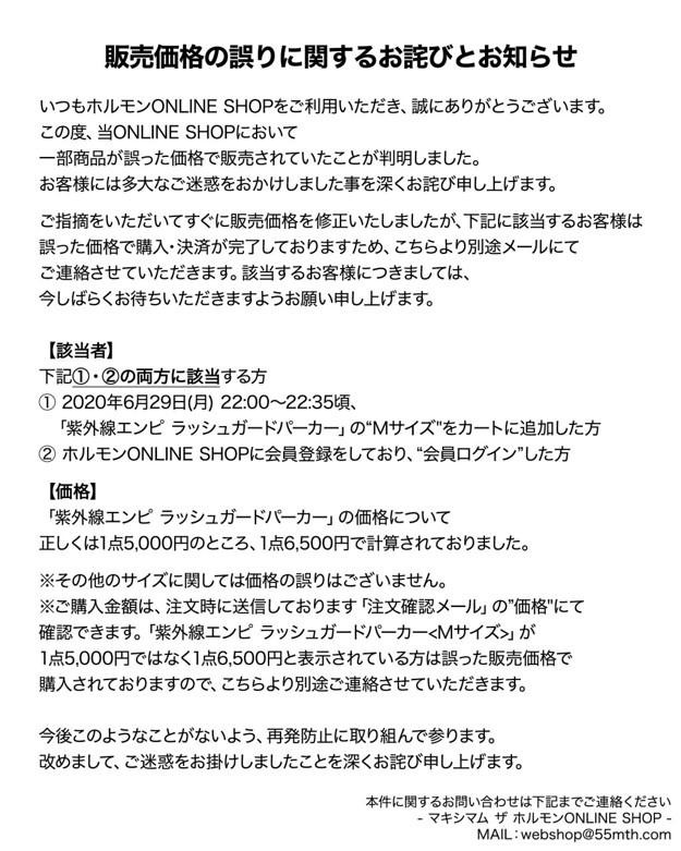 【ホルモンONLINE SHOPよりお詫びとお知らせ】