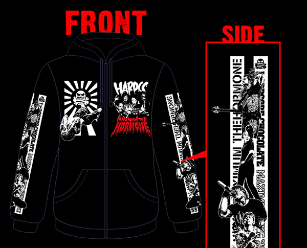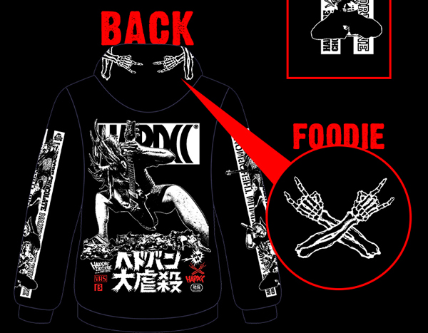 ホルモンパーカーの新作が登場します! その名も、“ホルモン×コアチョコ「ヘドバン大虐殺」コラボパーカー”。 |