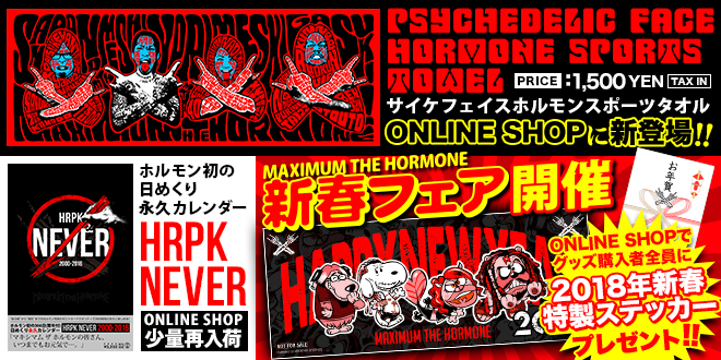 “サイケフェイスホルモンスポーツタオル”がONLINE SHOPに新登場!さらに、商品お買い上げのお客様全員にホルモンからHAPPY NEW YEARプレゼント!!