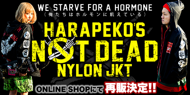 先月、復刻しました“ホルモンパーカー2”に続き、前回大変ご好評いただきました“HARAPEKO’S NOT DEAD ナイロンジャケット”が再入荷しました!
