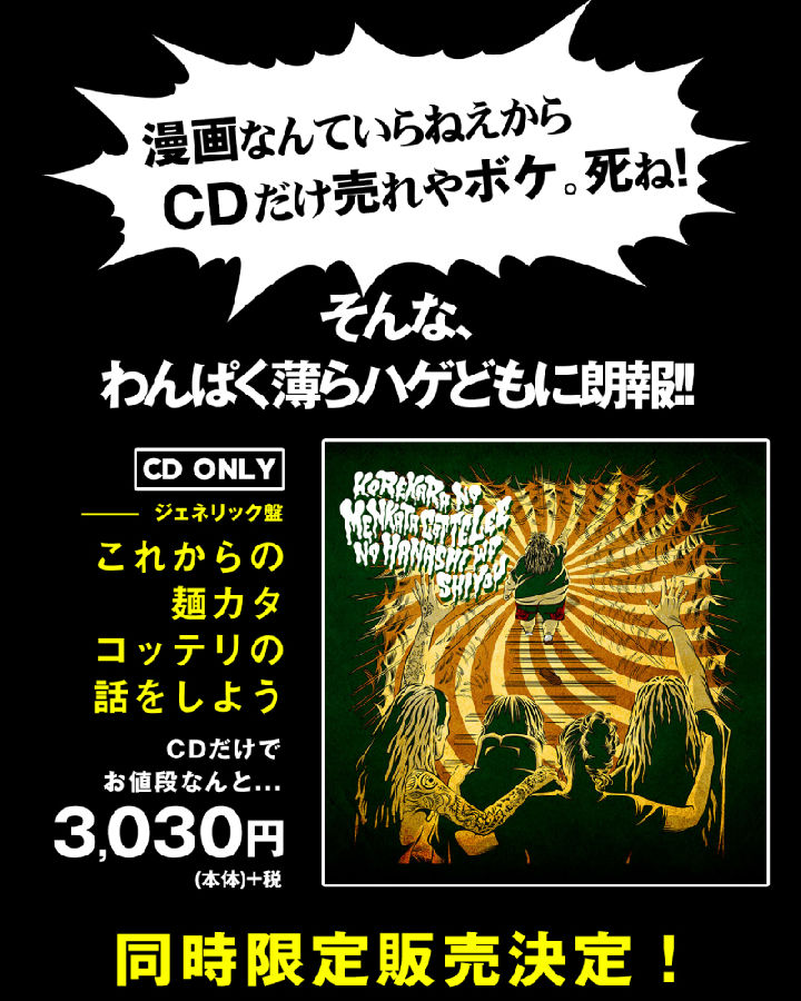 11/28(水)0:00より、新作「これからの麺カタコッテリの話をしよう」のCDのみの「ジェネリック盤」を数量限定にて販売します。