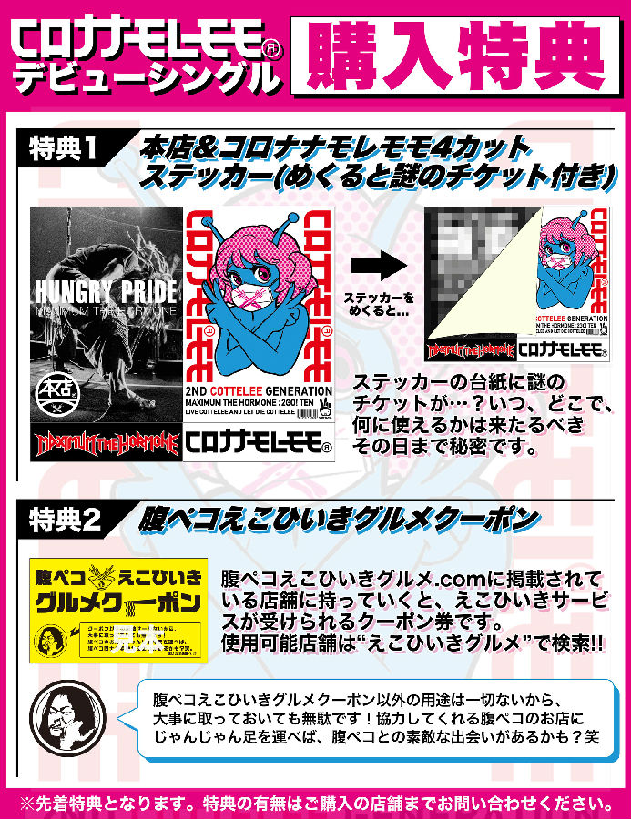 また、初回盤の先着購入特典として“本店&コロナナモレモモ4カットステッカー(めくると謎のチケット付き)”と、本店でお馴染みの“腹ペコえこひいきグルメクーポン”のプレゼントも決定しました。「謎のチケット」はいつ、どこで、何に使えるかは秘密ですので、然るべき「その時」まで今しばらくお待ちを!