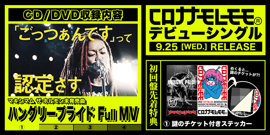 本店の未発売曲「ハングリー・プライド」のFull MVや“ガチンコ ザ ホルモン完全版”、本店・コロナナモレモモメンバーによる74分におよぶ撮り下ろし視聴コメント映像などを収録したコロナナモレモモのデビューシングル、「恋のメガラバ/包丁・ハサミ・カッター・ナイフ・ドス・キリ」のChaku-Don!まで残すところ2週間となりました!