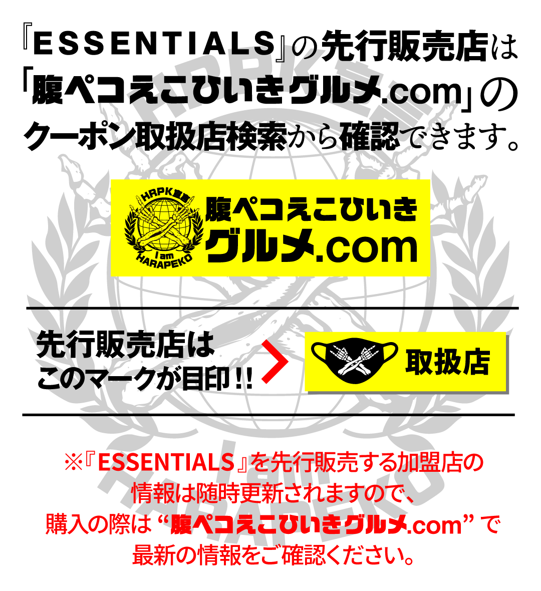 「ESSENTIALS」の先行販売店は「腹ペコえこひいきグルメ.com」のクーポン取扱店検索から確認できます。